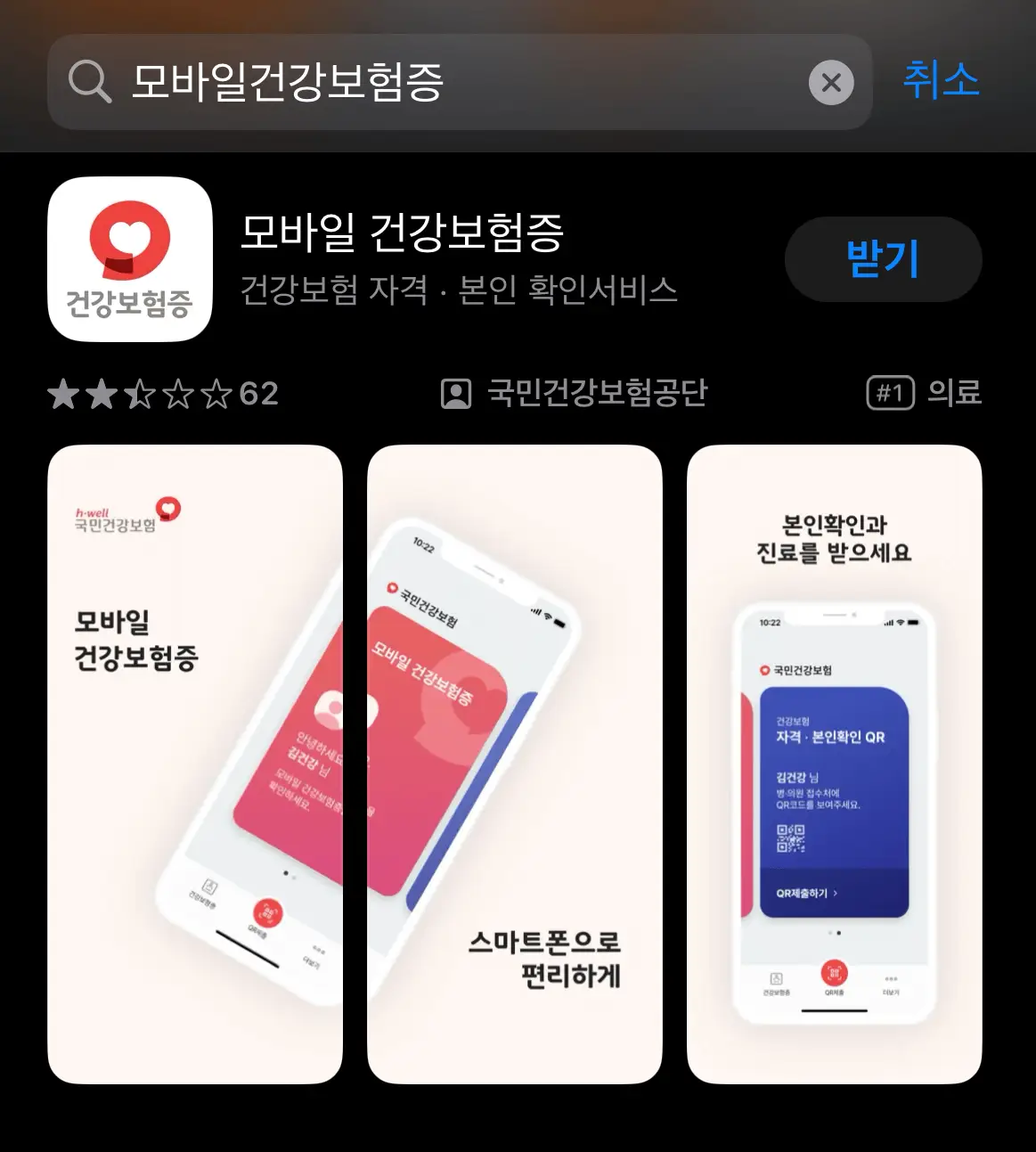 1. 스마트폰에서 [모바일 건강보험증] 앱을 설치합니다.