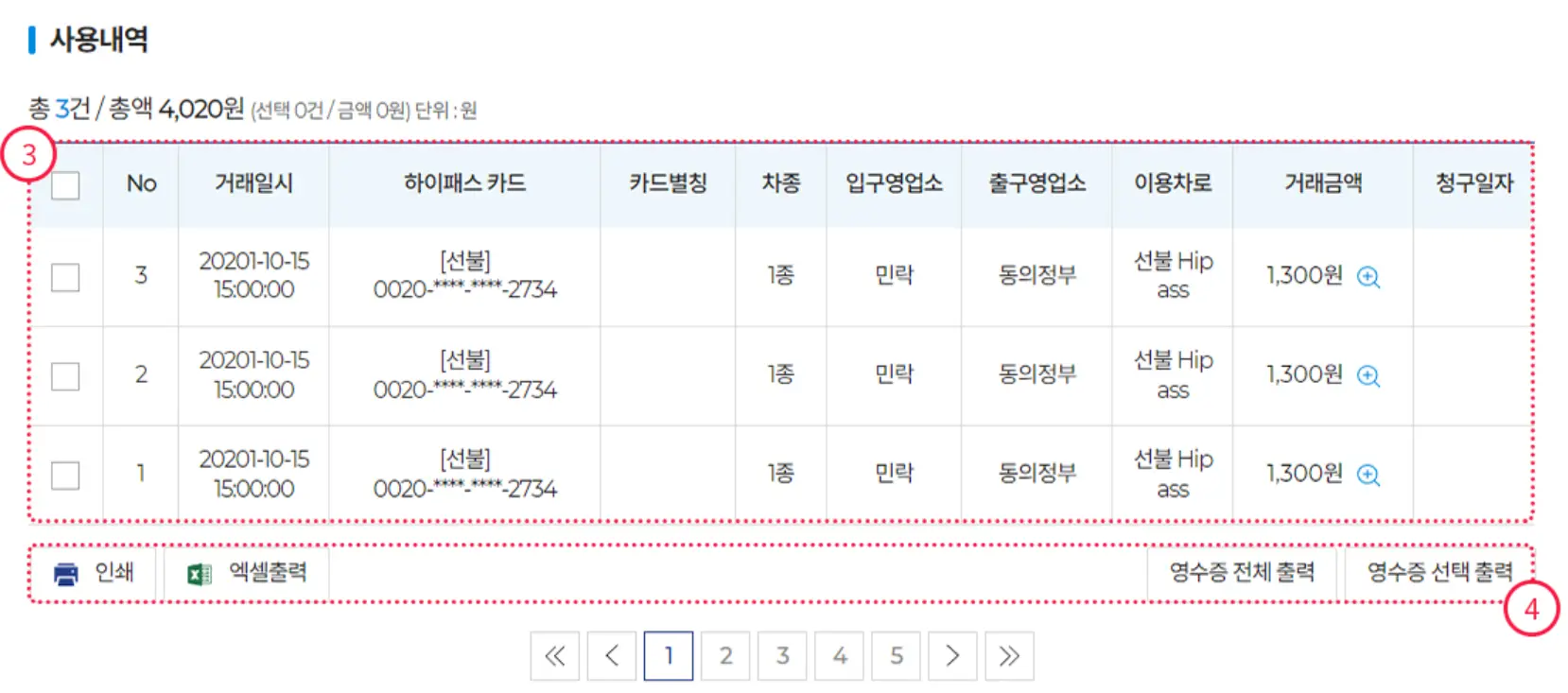 ④ 조회 결과를 인쇄, 엑셀출력, 영수증을 선택해서 출력할 수 있습니다.